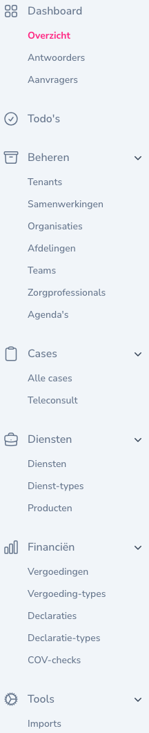 In de linkerkolom bevindt zich de hoofdnavigatie, waar de gebruiker altijd alleen de bronnen ziet die voor hem of haar toegankelijk zijn. Items kunnen ingeklapt zijn, door op het pijltje te drukken worden alle subitems getoond.