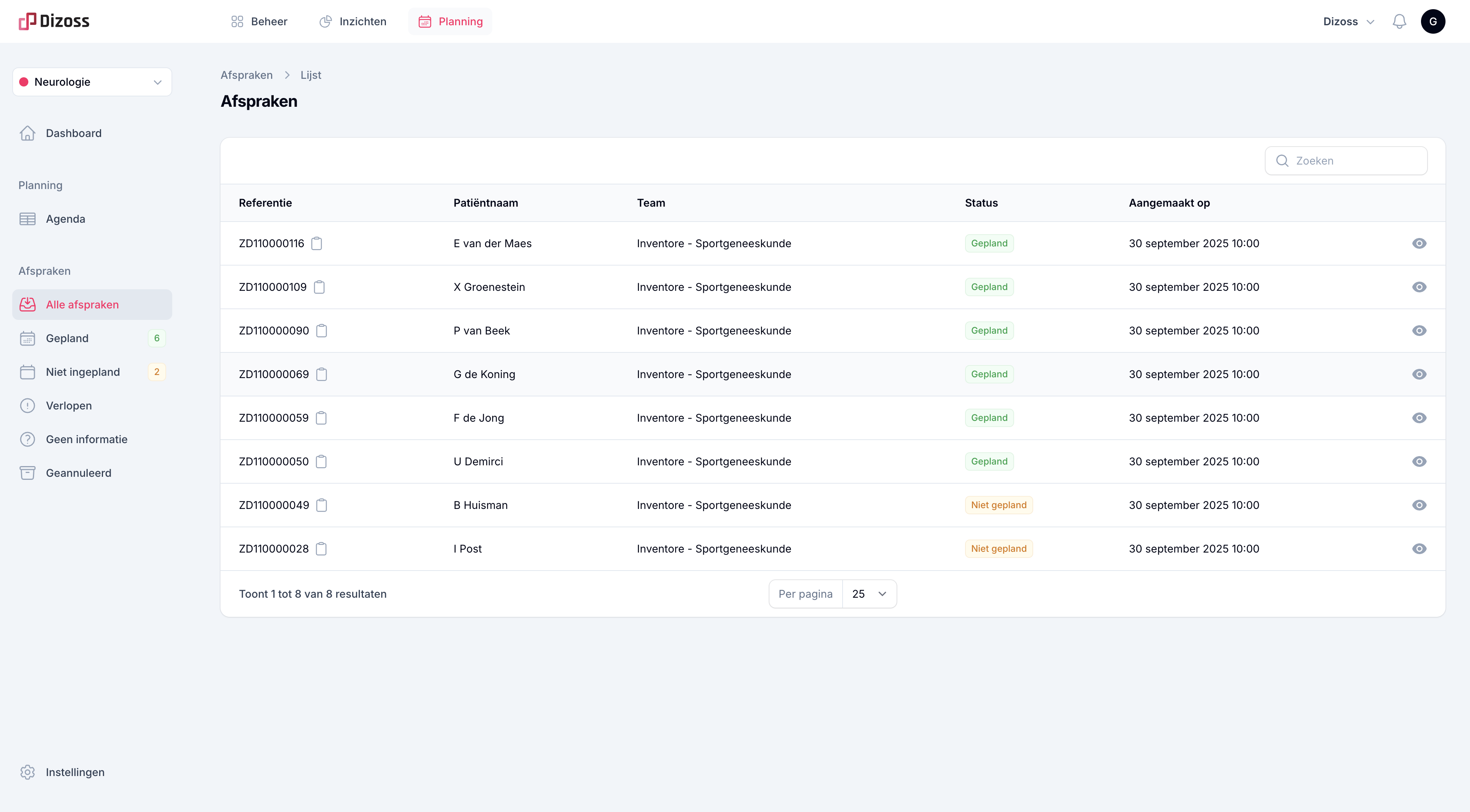 In het linker menu zijn er onder afspraken meerdere koppen te zien. Op deze manier is er een automatishce filtering gemaakt per status van de afspraken.