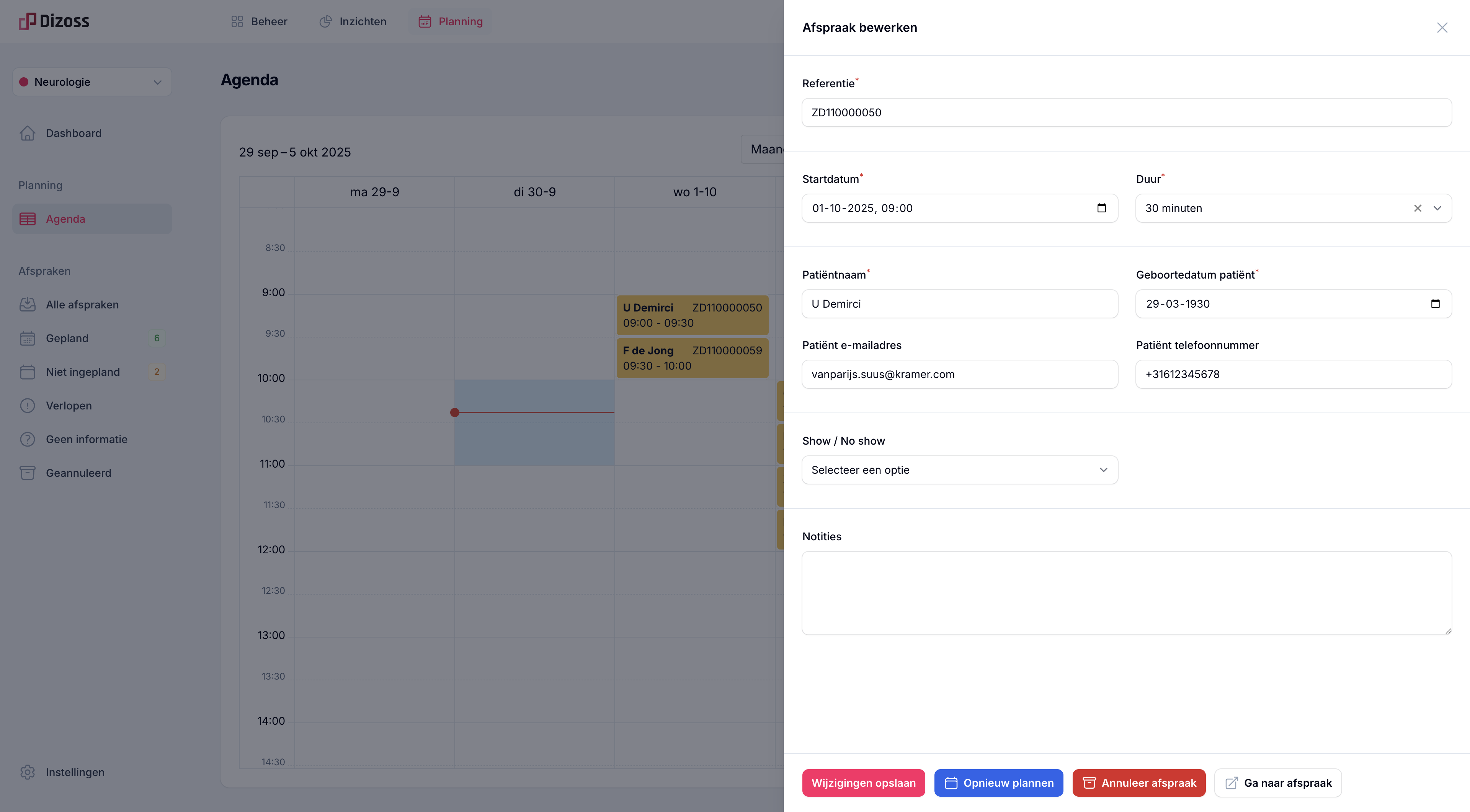 Wanneer er geklikt wordt op een afspraak verschijnt er een overlay. Afhankelijk van de rechten van de gebruiker kunnen er verschillende acties uitgevoerd worden.