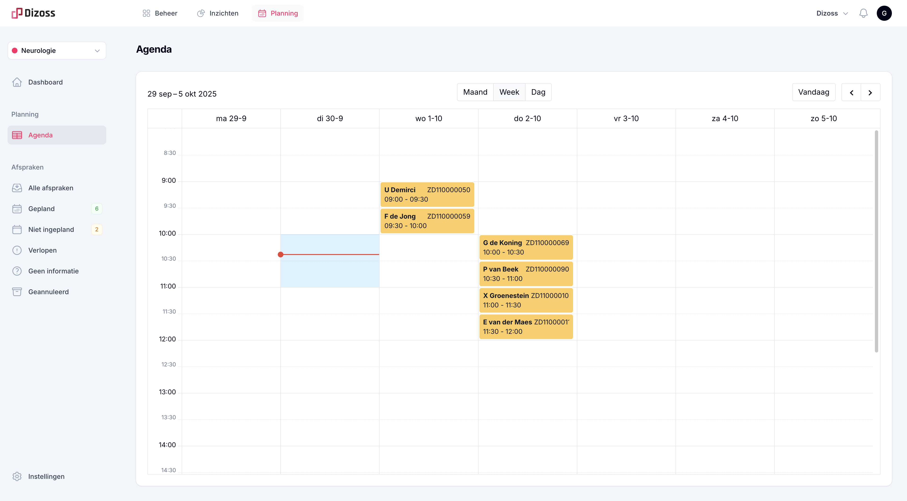 In de agenda zijn alle afspraken te zien, per dag, week of maand. De blauwe vlakken zijn beschikbare blokken binnen de agenda waar de patiënt een afspraak kan plannen. Er kunnen ook rode vlakken verschijnen. Dit zijn uitzonderingen op de beschikbaarheid. De kleur van de afspraken is in te stellen bij de agenda.
